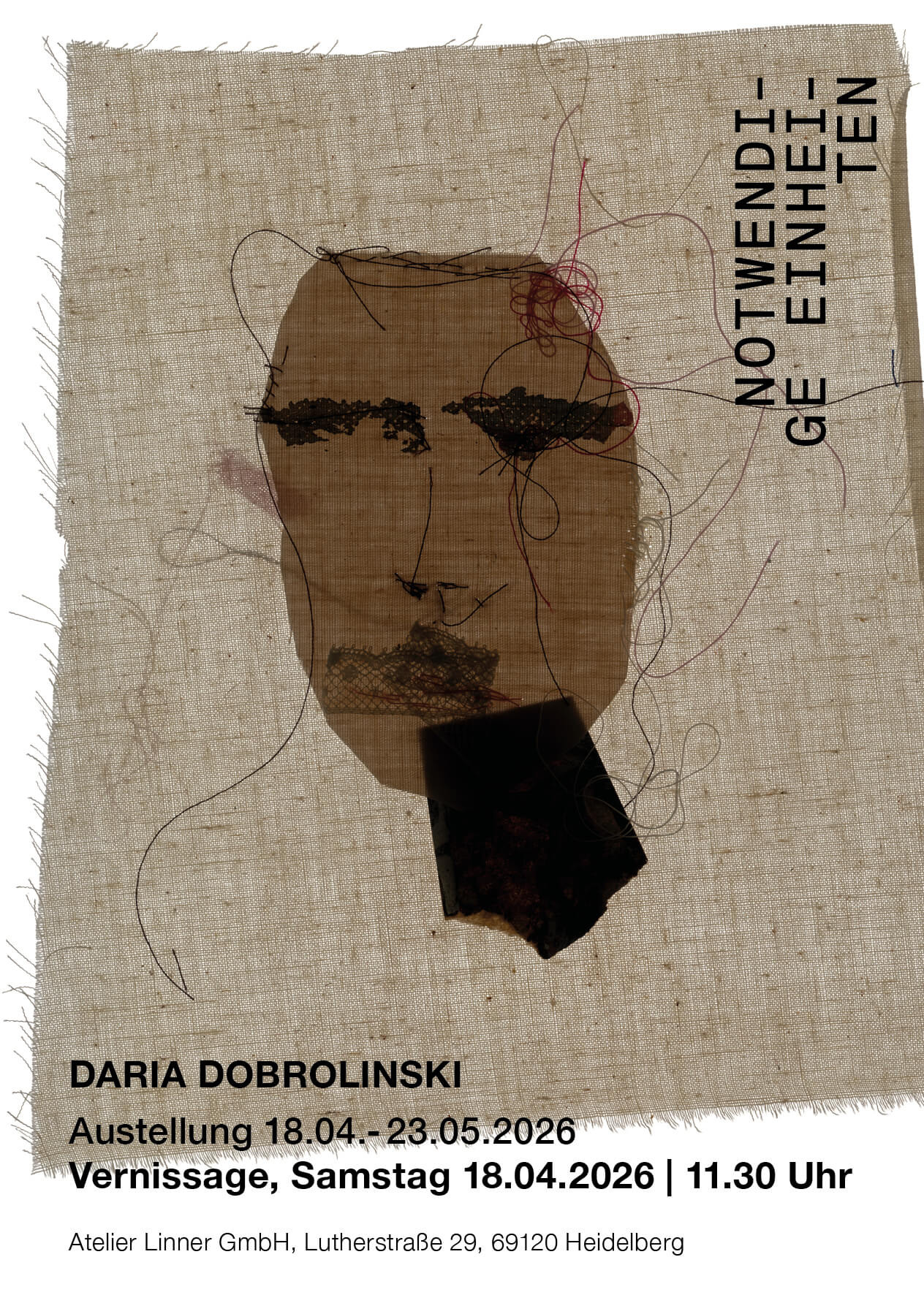 Daria Dobrolinski arbeitet mit Techniken aus den Bereichen Collage, Assemblage und Objektkunst. Mit Nadel und Faden verbindet sie Fragmente von Fotos, Zeichnungen und Stoffen. Die entstehenden Arbeiten erzählen von Erinnerungen, Lebenszyklen und Etappen. Die Fäden verweisen auf etwas Verbindendes – auf etwas, das Risse zusammenhalten und wieder loslassen kann. In diesem Schaffensprozess bleibt alles in Bewegung, bis es sich gemäß einer inneren Notwendigkeit ineinandergefügt hat. Beim Nähen spürt sie einen Antrieb, der sie leitet, und folgt einer inneren Dringlichkeit, die aus dem Unterbewusstsein an die Oberfläche drängt, ohne sich vollständig zu offenbaren.